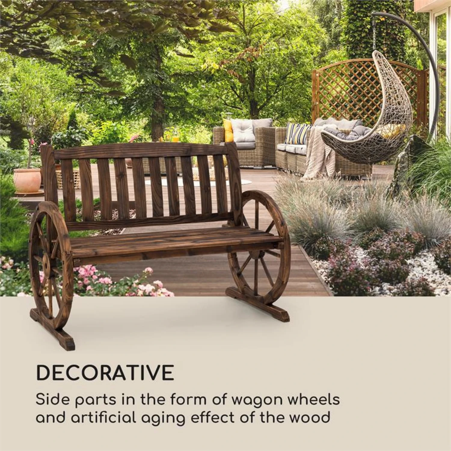 Wie zwei Wagenräder geformt vermitteln die Seitenstützen der Gartenbank die gemütliche Atmosphäre einer sonnendurchfluteten Bergalm und bringen rustikales Flair nach Hause. Zwischen liebevoll angelegten Blumenbeeten oder bunt bepflanzten Balkontöpfen wird die Gartenbank in jedem Heim zum dekorativen Blickfang. Damit die Sitzbank ihre Farbe und Beständigkeit erhält, wurde das verwendete Tannenholz dem Flame Shield Treatment, einer Brandbehandlung, unterzogen. So ist sie vor Wind und Wetter geschützt, erhält aber dank der künstlich gealterten Oberfläche zusätzlich einen ganz eigenen Charme.
