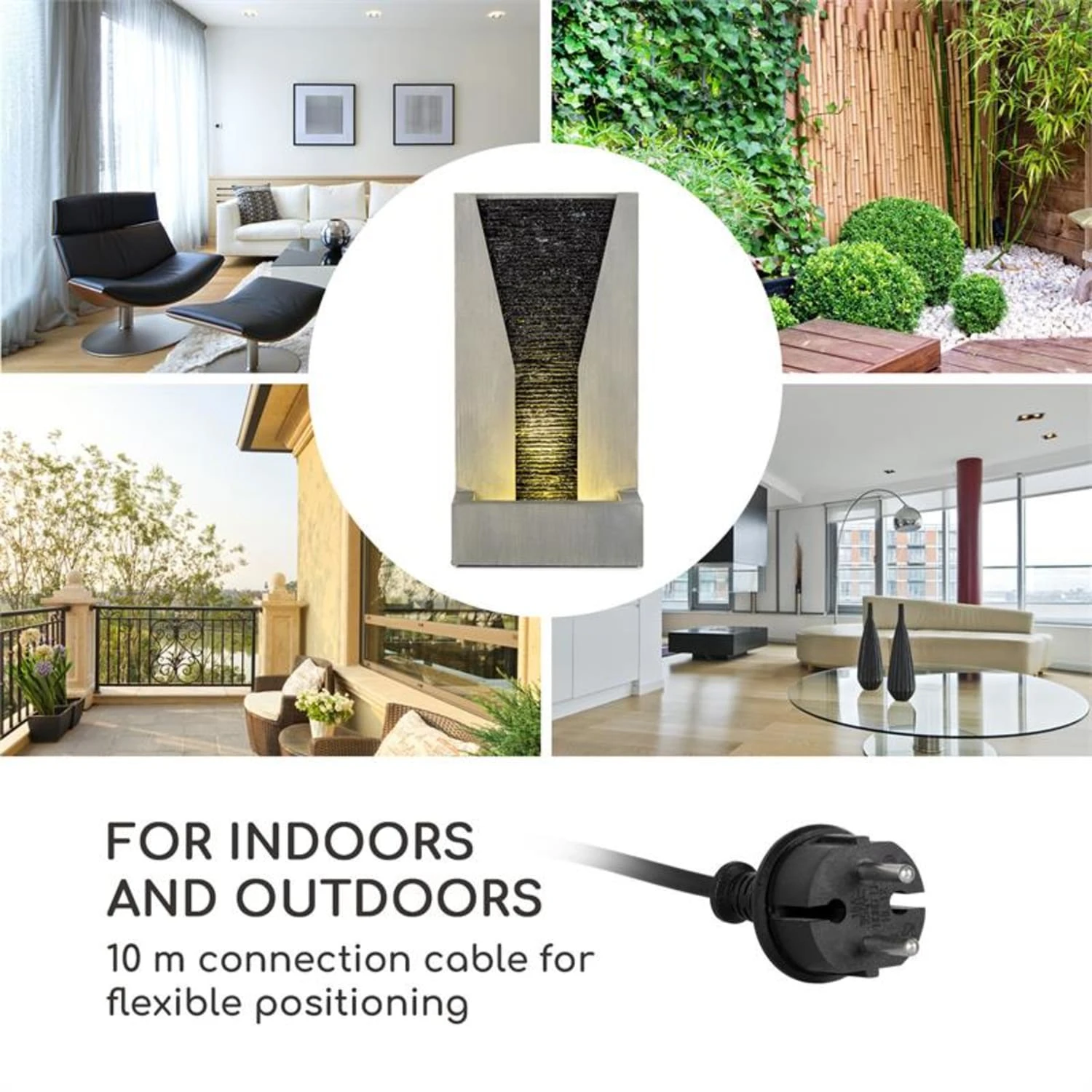 Dank extralangem 10 m Kabel lässt sich das Blumfeldt Riverrun Wasserspiel ausgesprochen frei platzieren. Alle Teile sind witterungsbeständig und können auch bei schlechtem Wetter im Freien bleiben.